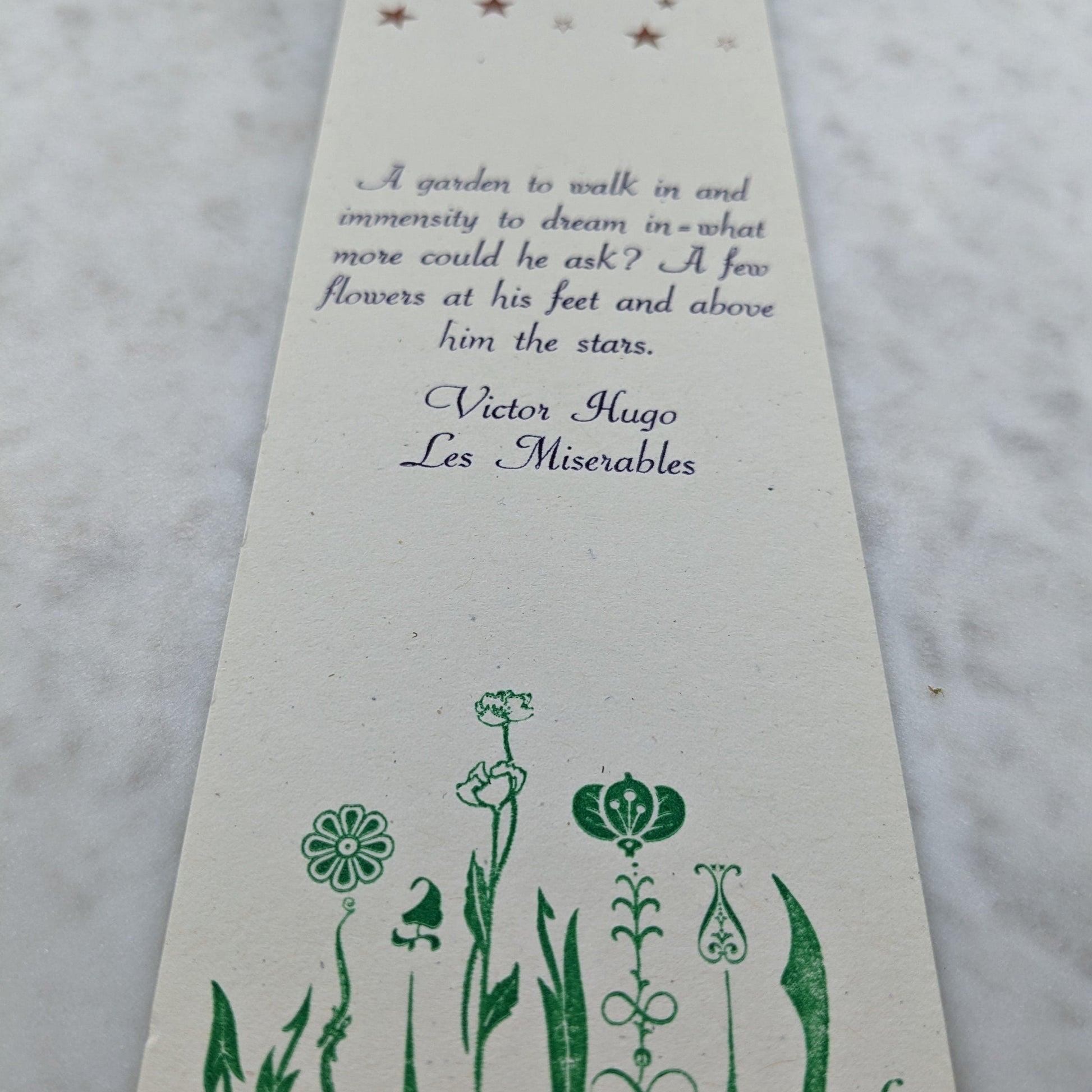 "A garden to walk in and immensity to dream in--what more could he ask? A few flowers at his feet and above him the stars." The quote by Victor Hugo in Les Miserables appears between copper stars and a green field of flowers on this letterpress bookmark.