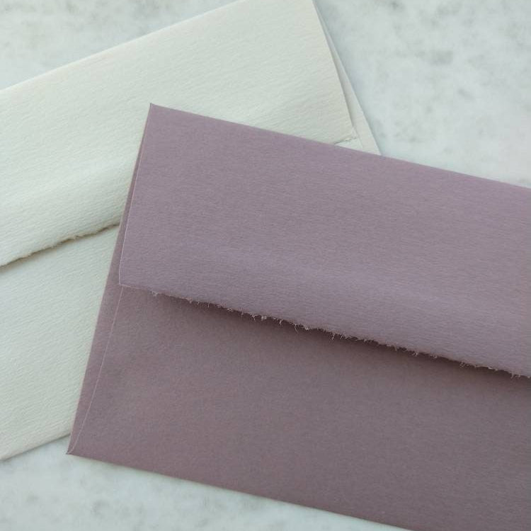Each card measures 4 1/4 x 5 1/2 (A2) and comes with a coordinating envelope with deckled edging. Please make sure to choose your envelope color! There are two choices: heather (purple), or mist (gray).