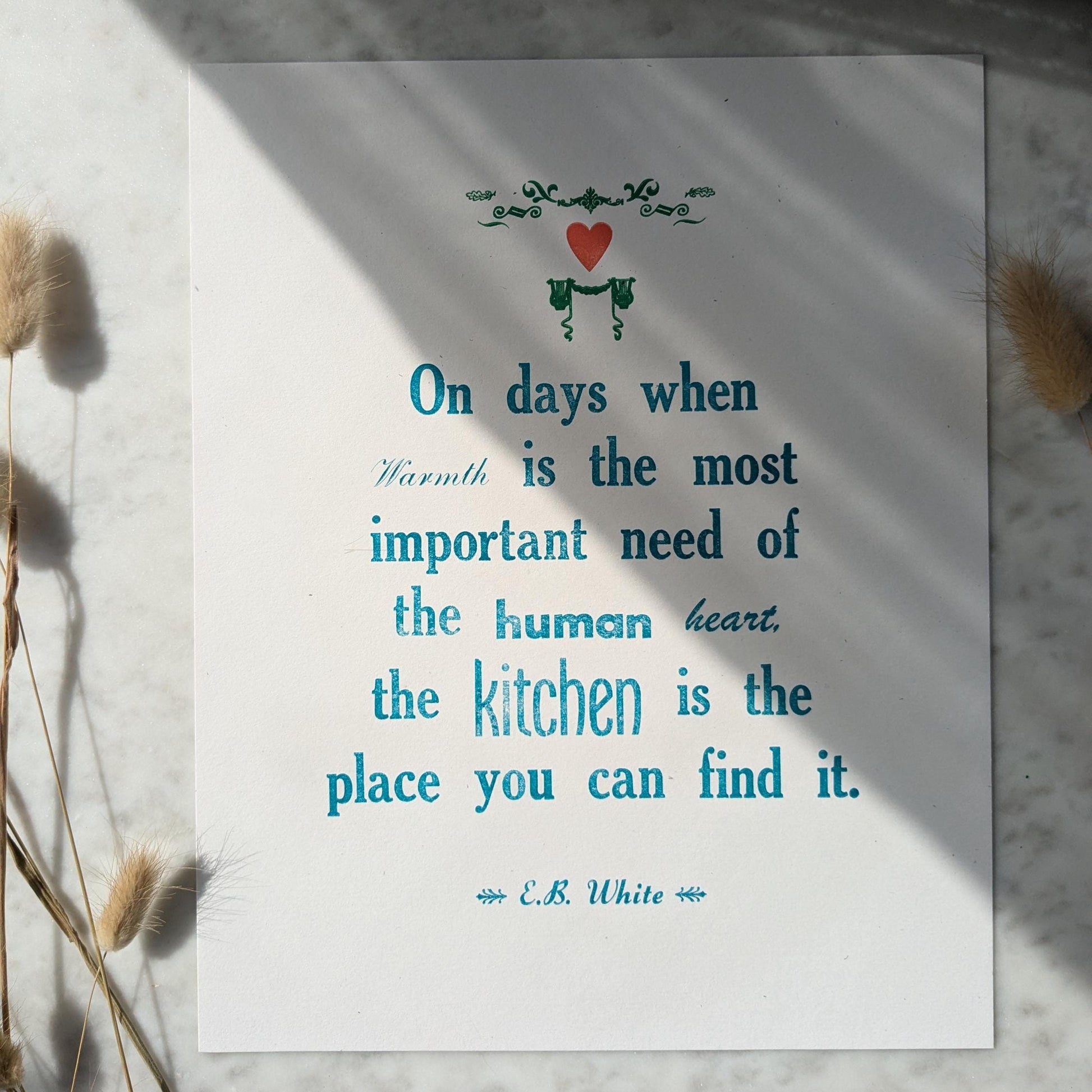 As the seasons change and the weather becomes cooler, we're always looking for cozy places. And many of us find the kitchen to be that place. This print, featuring a quote from the author of Charlotte's Web, E.B. White, will add to the warmth and heart of the kitchen. The quote reads, "On days when warmth is the most important need of the human heart, the kitchen is the place you can find it."