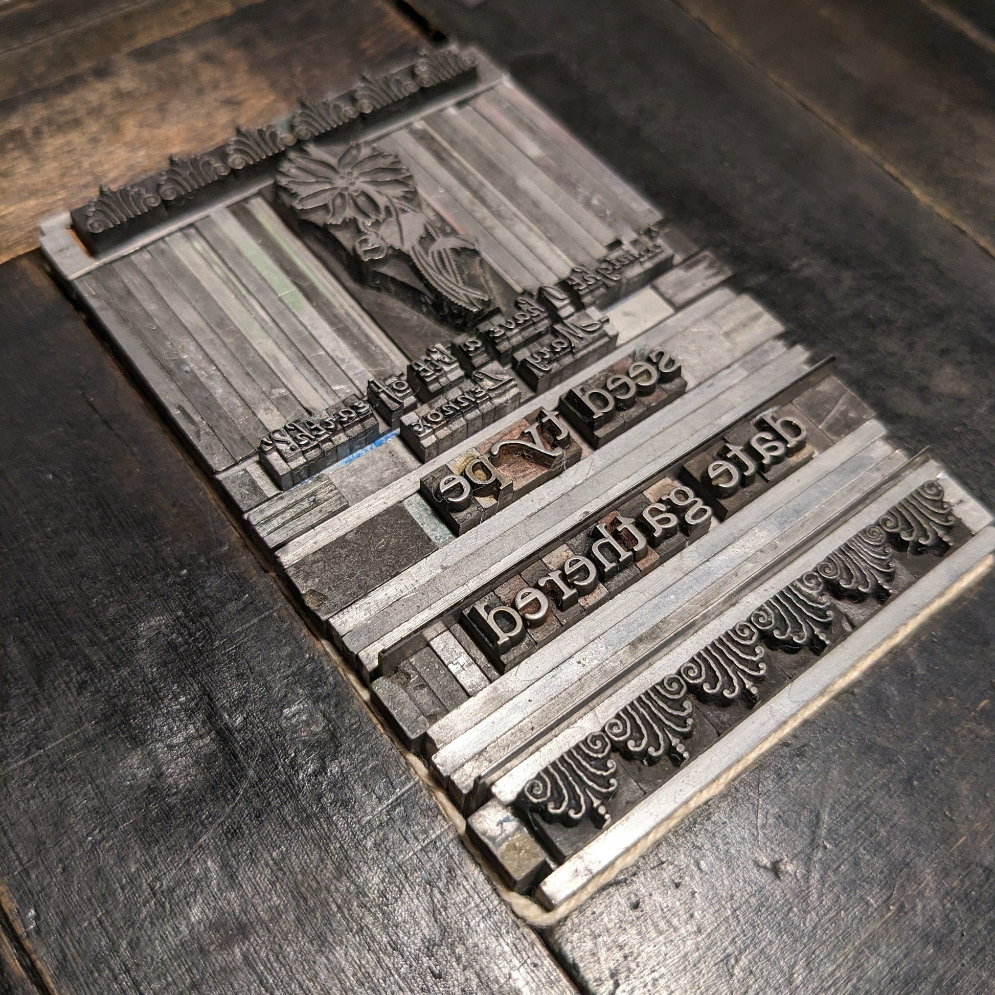 The designs were type set by hand using antique type and ornaments, and then printed with an 1893 Gordon press on kraft envelopes.