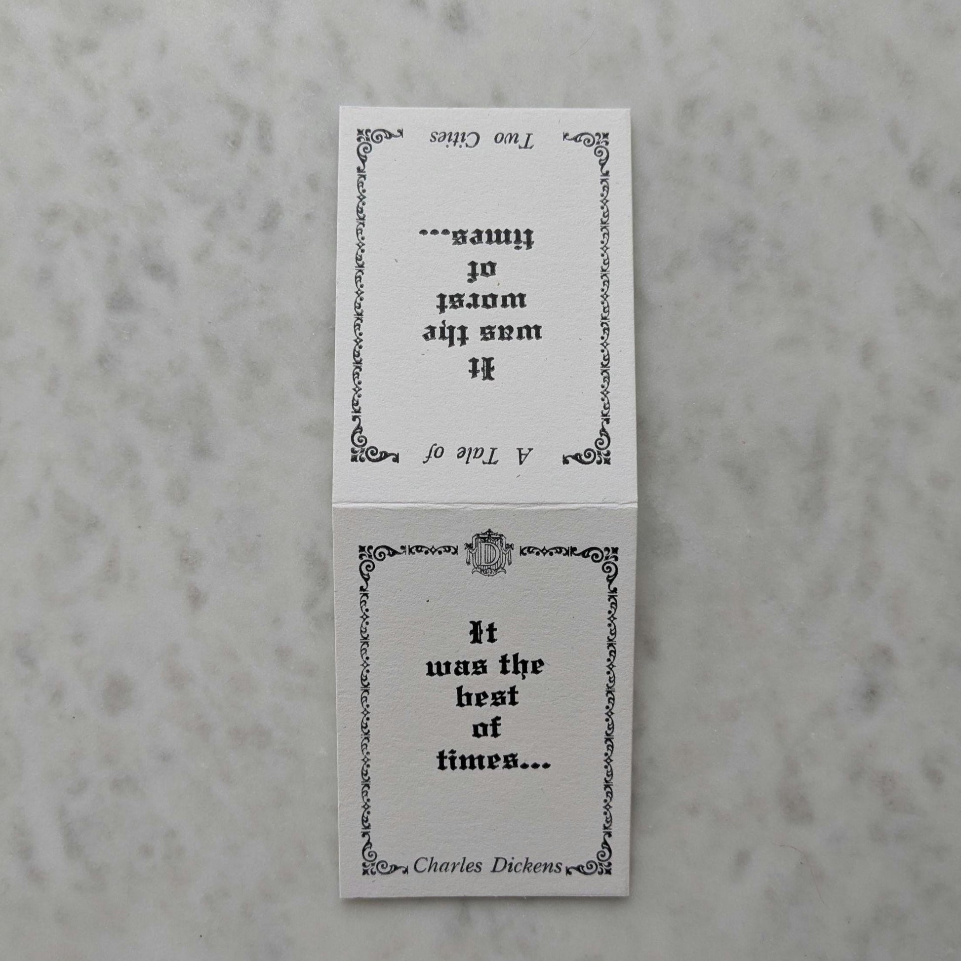 "It was the best of times..." on the front. "It was the worst of times..." on the back. Charles Dickens's A Tale of Two Cities iconic quote adorns this double-sided magnetic bookmark. Not only will it gently, but firmly, mark your spot in your book, it also won't fall out! On top of that, it's like you get two-for-one because you get to decide which side to clip it on. Is it more of a best of times book? Or a worst of times?